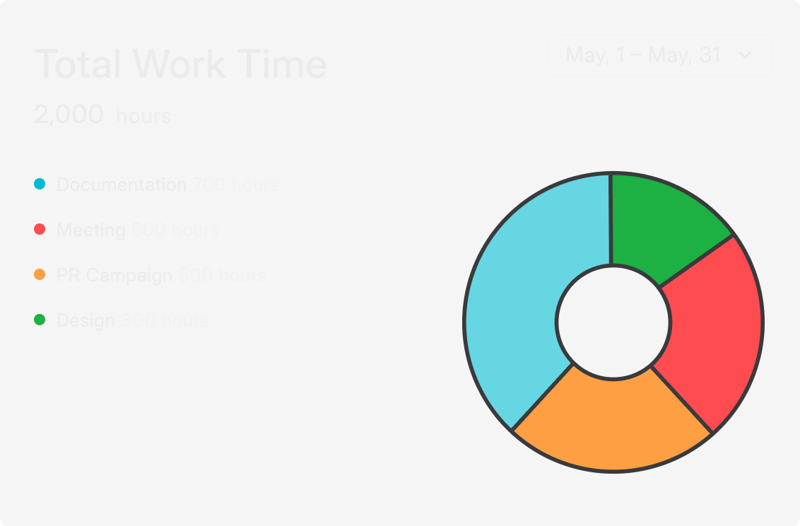 The first widget you see after clicking on the Dashboard button in the left sidebar is the Total Work Time widget. This widget features a chart that displays exactly how many hours were spent on specific projects or tags. You can select any time period for detailed analysis.