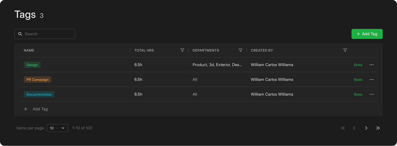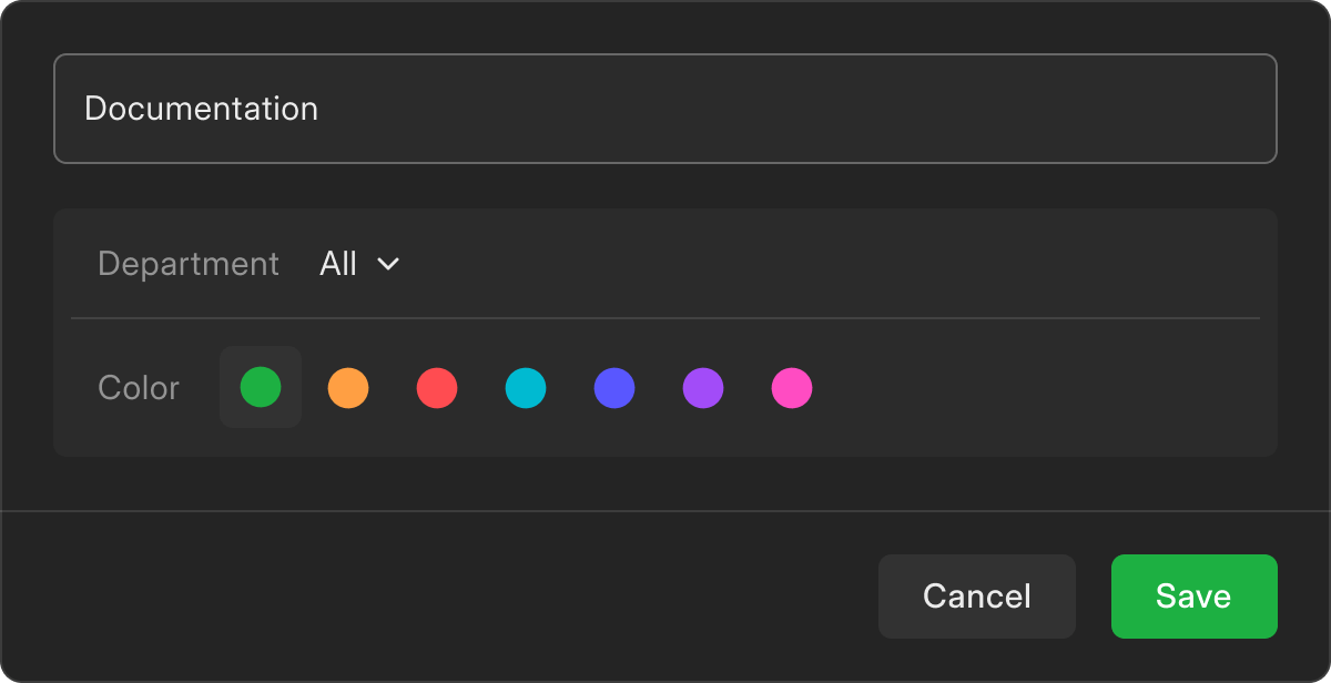 Choose the department(s) that will use the tag. Some tags are universal (e.g., Break, Meeting, or Planning), while others may be specific to a particular department (e.g., Translating, Bug Fixing, or Payroll).