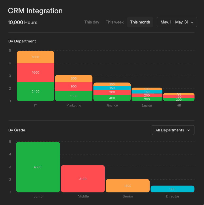 Here, you will find charts showcasing total hours spent on a specific tag and how time spent is distributed among different departments and grades.