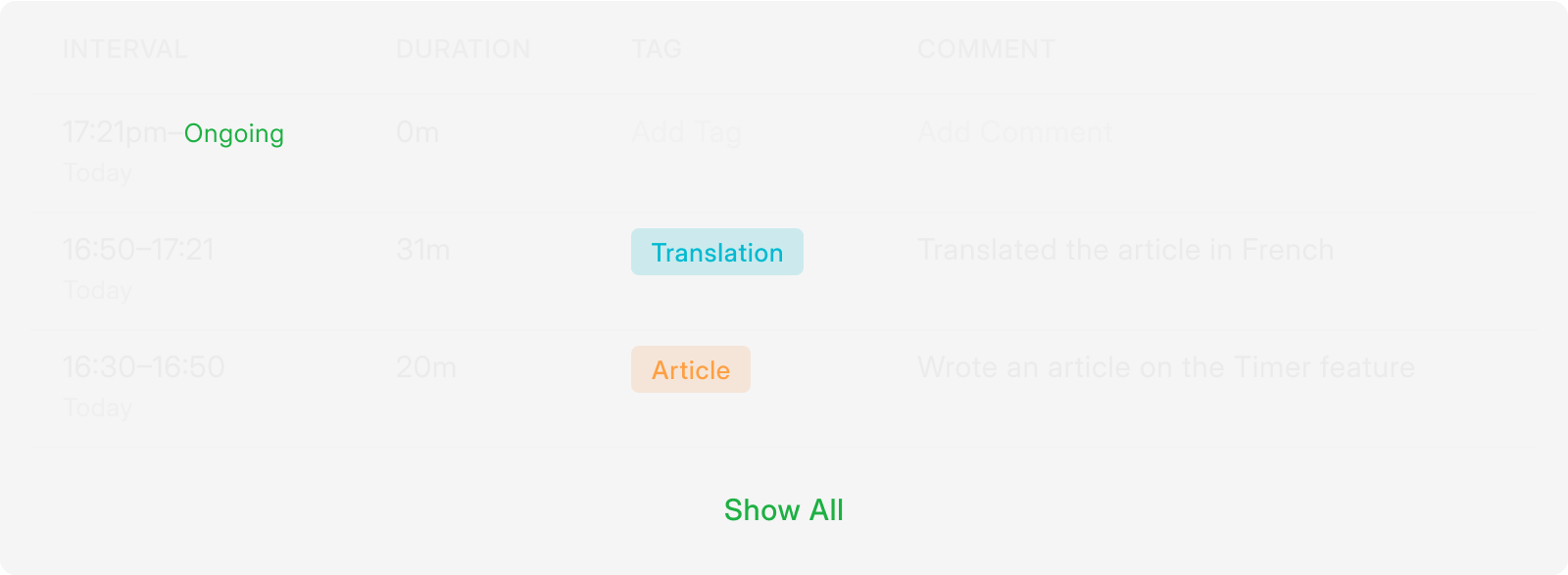 When all your activities are done, click Save & Stop. Below the timer, you’ll see a table displaying all your recorded intervals. You can update tags or edit comments at any time.